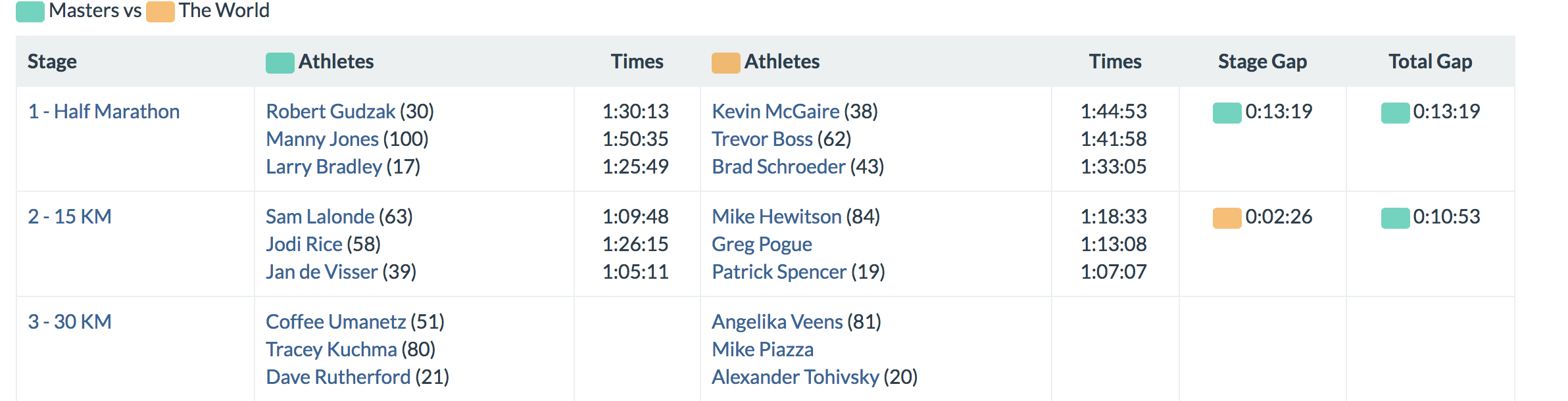 In the Masters vs. the World challenge, things got VERY interesting. With strong runs from Mike, Greg and Patrick, The World closed the gap. Now, after 108.1K of combined racing for each team, only 10:53 separate the two! Full Results.